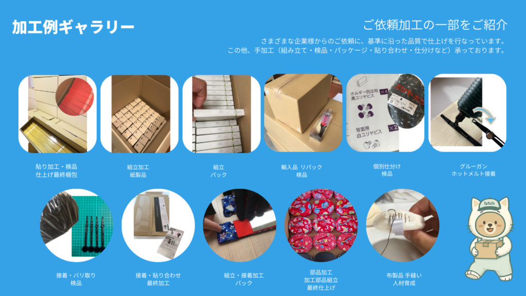 WorksBASE,手と手,業務委託,人材確保,軽作業,手加工,代行,協力,依頼,大阪,兵庫,関西,線加工,加工,組立,仕分,検品,縫製,作業,委託,内職,派遣ではない,人材募集,